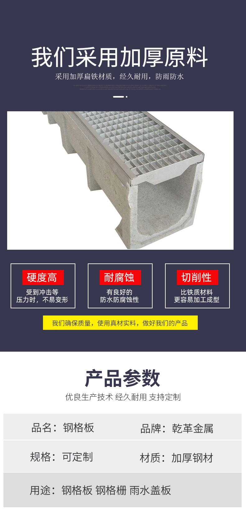 上海乾革金屬制品有限公司位于上海市松江區(qū)(詳情請咨詢18964233255)。我公司是一家集科研、生產(chǎn)、商貿(mào)于一體的大型絲網(wǎng)企業(yè)。公司主要生產(chǎn)銷售的產(chǎn)品有:玻璃鋼格柵、鍍鋅鋼格板、熱鍍鋅鋼格板、平臺鋼格板、互插鋼格板、溝蓋板、踏步板、地溝蓋板、不銹鋼井蓋、不銹鋼線性排水溝、樹脂排水溝、不銹鋼格柵、不銹鋼溝蓋板以及雨水篦子等;